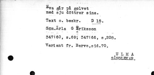 //// ^va gar på golvet //// med sju döttrar sina. //// -* *" - ' - - - //// Text o. beskr. D 15. //// Sdm.Arla G Eriksson //// _____* * ^ - f* , ; T ' ' . //// 347:60, s.69; 347:66, s,208. //// ^ - - - .. . . ^ //// Yariant fr. Barva,sid.70. //// ^ .U L M A //// ^ SANGLEKAR. ////