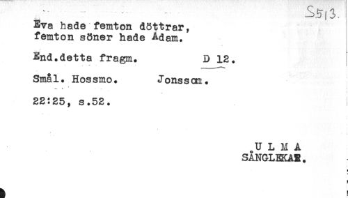 //// Eva hade femton döttrar, //// femton söner hade Adam. //// End.detta fragm. D 12. //// Snål. Hossmo. Jons sen. //// * //// - ! //// < //// W * //// 22125, s.52. //// * //// i //// F ////