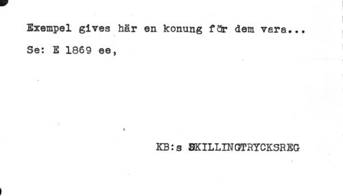 //// Exempel glves här en konung fSr dem vara... , //// « -.. ^ //// Se: E 1869 ee, //// t //// KB:s SKILLINGTRYCKSREG ////