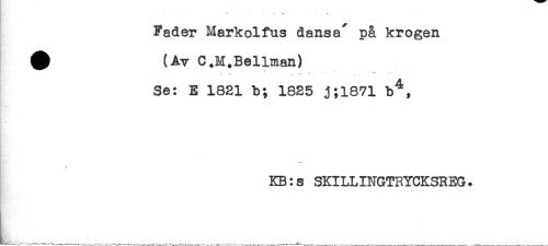 //// Fader Markolfus dansa" på krogen //// ^ (Av C.M.Bellman) //// } - -< ' .. - - - ' .. - //// Se: E 1821 b; 1825 j;l871 b^, //// - //// < -* //// KB:s SKILLINGTRYCKSREG. //// L....... ...... .____ ////