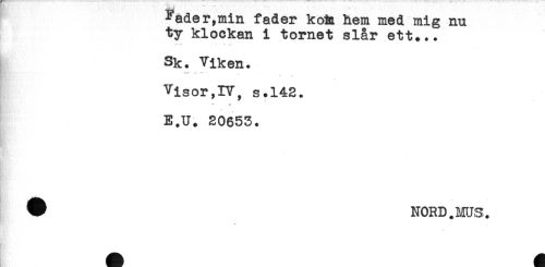 //// -Pader,min fader ko& hem med mig nu //// ty klockan i tornet slår ett... //// ... * , //// Sk. Viken. //// ! * //// Visor,IV, s.142. //// E.U. 20653. //// # NORD.MUS. ////