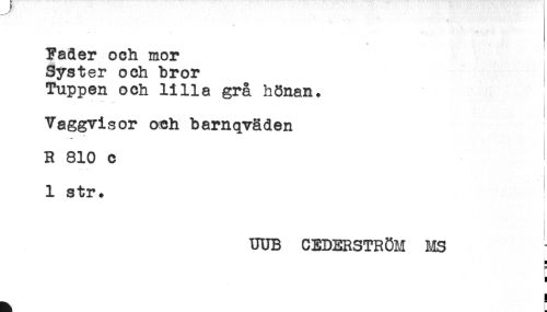 //// Fader och mor //// Syster och bror //// Tuppen och lilla grå hönan. //// Vaggvisor och barnqväden //// t //// * <* //// R 810 c //// 1 str. //// UUB CEDERSTROM MS - //// F //// t //// ^ ! ////