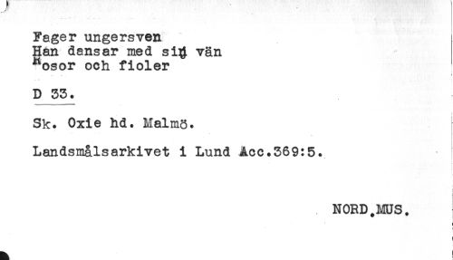 //// Fager ungersven //// Han dansar med si# vän //// Rosor och fioler //// -.. - 1 //// D 33. //// < //// Sk. Oxie hd. Malms. //// Landsmålsarkivet i Lund Acc.369:5. //// - //// j //// ! ////