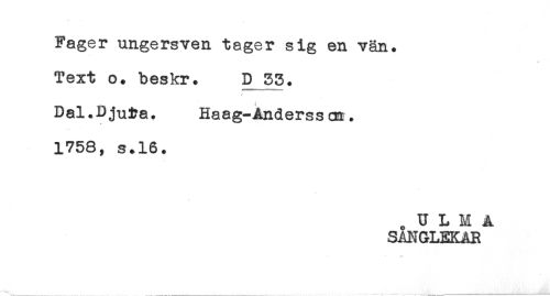 //// Fager ungersven tager sig en vän. //// * //// Text o. beskr. D 33. //// Dal.Djuta. Haag-Andersson. //// 1758, s.16. //// . U L M A //// SANGLEKAR ////