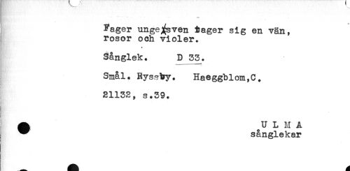 //// - - - ---- - - - . . m //// Fager ungersven iager sig en vän, //// rosor och violer. //// v //// Sånglek. D 33. //// Smål. Ryss^yy. Haeggblom,C. //// 21132, s.39. //// ^ ^U L M A //// ^ sånglekar ////