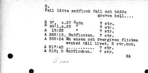 //// Fall lätta snöflock fall och bädda //// graven ka^l.... //// *** //// B 97. s.27 Snön 7 str. //// * 98?l,s.23 " 7 strj //// A 16:25 " 7 str. //// A 222:13, Snöflocken. 7 str. //// A 382:24 En ensam och övergiven flickas //// avsked till livet. 5 str.kom. //// A 517:43 ....... 7 str. //// ^ A 518; 8 Snöflocken. 7 str. ////