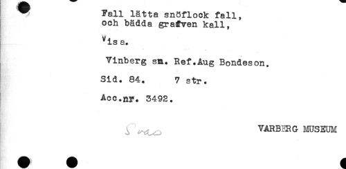 //// ^ Fall lätta snHflock fall, //// och bädda graCven kall, //// Visa. //// * //// Vinberg sm. Ref.Aug Bondeson. //// . . <* * ... - //// Sid. 84. 7 str. //// Acc.Rp. 5492. //// ^ VARBERG MUSEUM ////