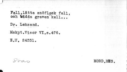 //// n - - . //// Fall,lätta snöflock fall, //// och Mdda graven kall... //// Dr. Leksand. //// ... - --- //// Mskpt.Visor VI.s.476. //// E.U. 24331. //// i //// ! //// ! //// < f //// . //// ^ MORD.ms. ! //// i ////