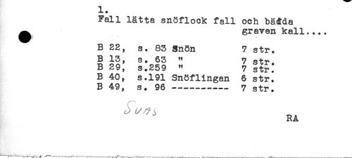//// JL. //// Fall lätta snöflock fall och bädda //// ^ graven kall.... //// B 22, s. 85 Snön 7 str. //// B 13, s. 65 " 7 str. //// B 29, s.259 " 7 str! //// B 40, s.191 Snöflingan 6 str. //// B 49, s. 96---- 7 str. //// RA ////