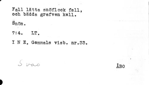 //// t ' //// t //// Fall lätta snöflock fall, //// och bädda grafven kall. //// Snön. //// 7:4. LT. //// I N E. Gammals visb. nr.33. //// * ] //// J) ^Bo ////