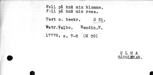 //// Fall på knä min blomma, //// fall på knä min rosa. //// Text o. beskr. D 31. //// 9str.Valbo, Wendin,W. //// 17778, s. 7-8 (M 30) //// . //// U L M A //// ^ SÅNGLEKAR. ////