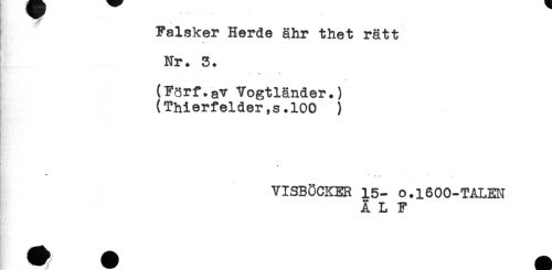 //// Falsker Herde ähr thet rätt //// Nr. 3. //// - K - //// (Förf.av Vogtländer.) //// (Thierfelder,s.lOO ) //// t //// VISBÖCKER 15- O.1600-TALEN //// ALF ////
