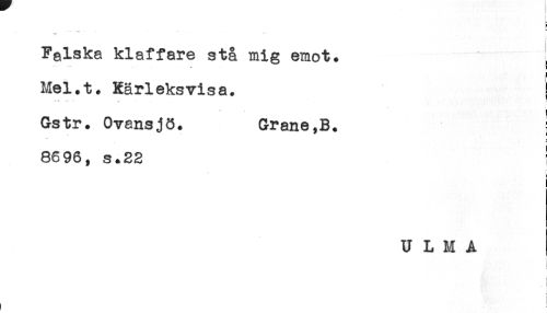 //// t //// .... //// -' *' . //// i //// Falska klaffare stå mig emot. ^ //// ! //// Mel.t. Kärleksvisa. j //// - * --- - i //// Gstr. Ovansjö. Grane,B. ; //// v . //// 8696, s.22 ' //// U L M A ////