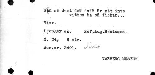 //// Fan så dumt det ändå är att inte //// " vitten ha på fickan... //// Visa. //// ^ ....... < //// Ljungby sn. Ref.Aug.Bondeson. //// S. 34, 9 str. //// Acc.nr. 3491. ^^ //// VARBERG MUSEUIVC //// //// /