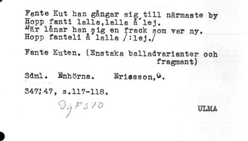 //// Fante Kut han gångar sig till närmaste by- //// Hopp fanti lalla,lalla å'lej. //// -"är lånar han $ig en frack som var ny. //// Hopp fanteli å lalla /:iej. //// /.- <* //// Fante Kuten. (Enstaka balladvarianter och //// fragment) //// Sdml. Enhörna. Eriesson,^. //// ^ - * //// ** ..... * -..... * //// 347;47, s.117-116. //// ULMA ////