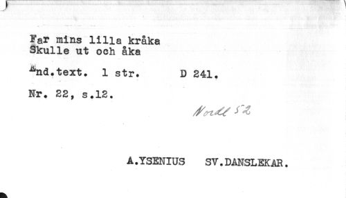 //// Far mins lilla kråka //// Skulle ut och åka //// ^nd.text. 1 str. D 241. //// Nr. 22, s.12. //// A.YSENIUS SV.DANSLEKAR. ////
