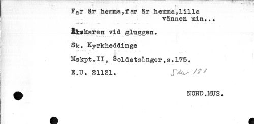 //// Fgr är hemma,far är hemma,lilla //// vännen min... //// älskaren vid gluggen. //// Sk. Kyrkheddinge //// ' -A* - //// * //// Mskpt.II, Soldatsånger,s.175. //// v - //// E.U. 21131. J^^ //// - //// i //// ^ NORD.HUS. ////