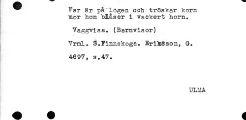 //// ^ Far är parlogen och tröskar korn //// mor hon bäaser i vackert horn. //// * " //// Vaggvisa. (Barnvisor) //// -- * -- - //// Vrml. S.Finnskogs. Erik§son, G. //// 4697, s.47. //// ULMA ////
