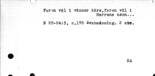 //// Faren väl i vänner kär a, far en väl i //// Herrans namn... //// ** //// B 23-24:3, s.178 Avskedssång. 2 sie. //// r //// ^ RA ////