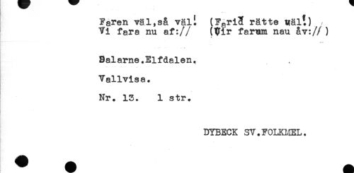 //// Faren väl,så väli (F^ri^ rätte vält) . //// Vi fara nu af:// farmn nau åv:// ) //// . //// - //// ., - - ... - //// Salarne.Elfdalen. //// Yallvisa. //// Nr. 13. 1 str. //// DYBECK SV.FOLKI.IEL. //// * //// - - ////
