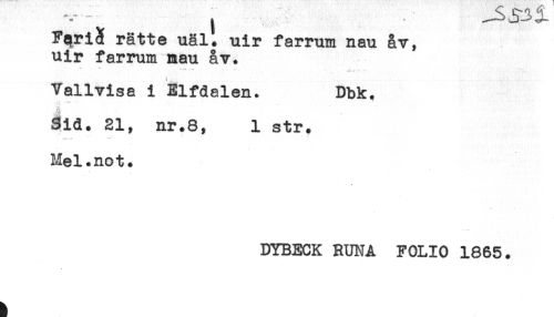 //// rätte uäl* uir farrum nan åv, //// uir farrum mau åv. //// * * //// Vallvisa i Elfdalen. Dbk. //// Sid. 21, nr.8, 1 str. //// Mel.not. //// DYBECK RUNA FOLIO 1865. ////