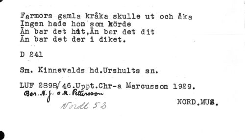 //// Farmors gamla kråka skulle ut och åka //// Ingen hade hon son hörde //// An bar det hit,Ån bar det dit //// An bar det der i diket. //// * .* //// D 241 //// Sm. Kinnevalds hd.Urshults sn. //// * //// LUF 289Q/46.Uppt.Chr-a Marcusson 1929. //// ^^ //// ' NORD.MUZ. ////