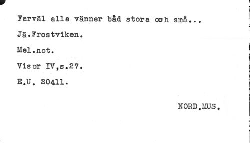 //// § //// * //// Farväl alla vänner båd stora och små... //// Jä.Frostviken. //// Mel.not. I //// * //// Visor IV,s.27. //// E.U. 20411. ! //// ! //// NORD,MUS. //// t //// < ////