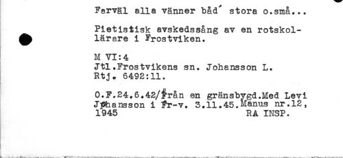 //// Farväl ana vänner Daa stora o.små... //// Pietistisk avskedssång av en rotskol- //// ^ lärare i Frostviken. //// M VI: 4 //// Jtl.Frostvikens sn. Johansson L. //// Rtj^ 6492:11. //// T "' //// O.F.24.6.42/§*rån en gränsbygd.Med Levi //// Johansson i Fr-v. 3.11.45.Manus nr.12, //// 1945 RA INSP. //// jt ////