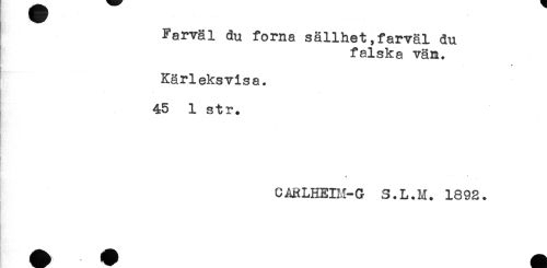 //// Farväl du forna sällhet,farväl du //// falska vän. //// . //// Kärleksvisa. //// ! //// 45 1 str. //// s * //// - //// CARLHEIM-G S.L.M. 1892. //// . ////