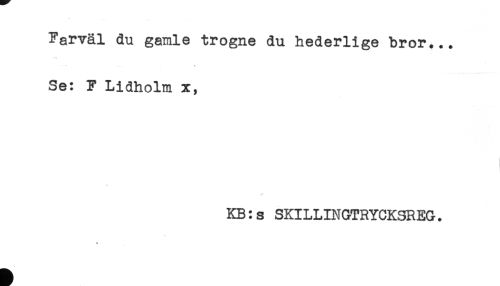 //// Farväl du gamle trogne du hederlige bror... //// Se: F Lidholm x, //// KB:s SKILLINGTRYCKSREG. ////