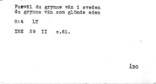 //// FaBväl du grymme vän i sveden //// du grymma vän som glömde eden //// j //// 8:4 LT //// INE 29 II s.61. //// * //// ÅBO //// .-^J ___^^ ^ _____j___ ____^ ////