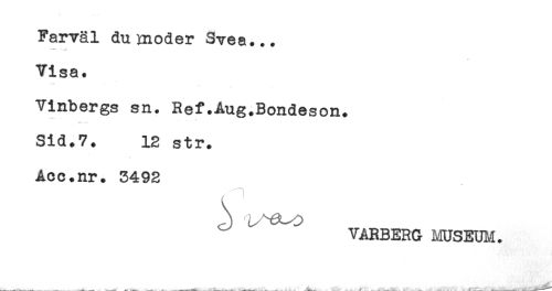 //// Farväl du moder Svea... //// ***** //// Visa. //// Vinbergs sn. Ref.Aug.Bondeson. //// Sid.7. 12 str. //// Aoc.nr. 3492 //// VARBERG MUSEUM. ////