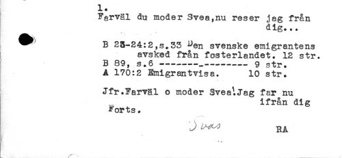 //// -t* + //// Farväl du moder Svea/nu reser jag f rån //// dig... //// * B 23-24:2,s.33 L)en svenske emigrantens //// avsked fr&n fosterlandet. 12 str. //// B 89, s.6----.-----9 str. //// A 170:2 Emigrantvisa. 10 str. //// Jfr.Earval o moder 3vea\jag far nu //// ifrån dig //// Forts. //// J ^ RA ////