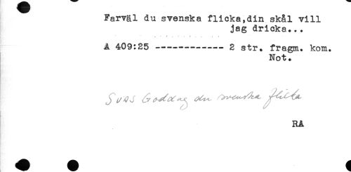 //// Farväl du svenska flicka,din skål vill //// jag dricka... //// ^ - ^ . .t //// A 409:25 --- 2 str. fragm. kom. //// Not. //// RA ////