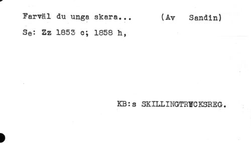 //// Farväl du unga skara... (Av Sandin) //// * * //// Se: Zz 1853 c; 1858 h, //// KB:s SKILLINGTRYC KSREG. ////