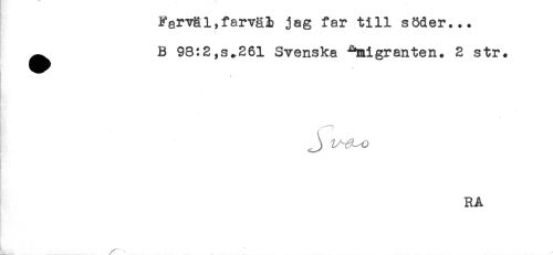 //// Farväl,farväl jag far till söder... //// ** . //// ^ B 98:2,s.261 Svenska ^migranten. 2 str. //// J) //// RA //// L.....- ////
