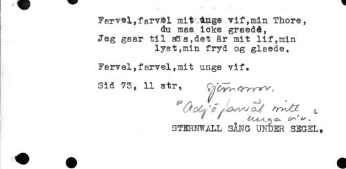 //// Farvel,farväl mit Inge vif,min Thore, //// du maa icke graedd, //// Jeg gaar til s8s,det är mit lif,min //// lyst,min fryd og glaede^ //// Farvel,farvel,mit unge vif. //// Sid 73, 11 str, //// STERNWALL SÅNG UN&ER SEGEL+ ////