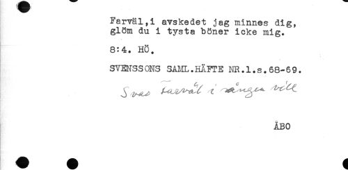 //// Farväl,! avskedet jag minnes dig, //// glöm du i tysta böner icke mig. //// 8:4. HÖ. //// SVENSSONS SAML.HÄFTE NR.l.s.68-69+ //// * //// '-' ^ C f^. //// ÅBO ////