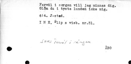 //// Farväl i sorgen vill jag minnas dig. //// Glom du i tysta lunden icke mig. //// 6*4. J-stad. //// I N E. 3lip s visb. nr.31. //// - //// B*' //// - ' ////
