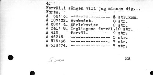 //// Farväl,i sången vill jag minnas dig... //// Fcp 15 s, * ** //// A 68: 6. ---g str.kom. //// A 107:32. Avskedet. 8 str. //// A 200: 4. Kärleksvisa 2 str. //// A 341: 8. Ynglingens farväl.10 str. //// A 416 Farväl. 9 str. //// A 463:5 - -----5 str. //// A 516:66 ----- - 7 str. //// A 518:74. ----7 str. //// * Jz^ RA ////