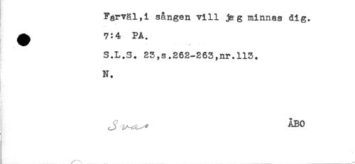 //// Farväl,i sången vill jsg minnas dig. //// * //// ^ 7:4 PA. //// S.L.S. 23,s.263-263,nr.113. //// N. //// J A ^ ÅBO ////