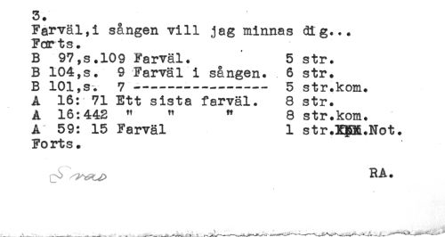 //// Farväl,i sången vill jag minnas dig... //// Farts. //// B 97,s.109 Farväl. 5 str. //// B 104,s. 9 Farväl i sången. 6 str. //// B 101,s. 7---- 5 str.kom. //// A 16: 71 Ett sista farväl. 8 str. //// A 16:443 " " " 8 str.kom. //// A 59: 15 Farväl 1 str.XgR.Not. //// Forts. //// RA. ////