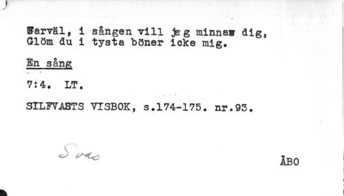 //// Barväl, i sången vill jsg minnaw dig, //// Glöm du i tysta böner icke mig. //// En sång //// 7:4. LT. //// r //// SILFVASTS VISBOK, s.174-175. nr.93. //// \ //// ^ ^ ÅBO //// * ////