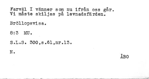 //// Farväl I vänner son nu ifrån oss går. //// Vi måste skiljas på levnadsfärden. //// Bröllopsvisa. //// 8:3 MU. //// S.L.S. 300,s.61,nr.13. //// N. //// ÅBO ////