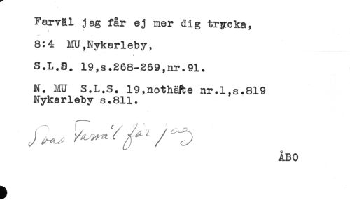 //// Farväl jag får ej mer dig trycka, //// f " ^ //// 8:4 MU,Nykarleby, //// S.L.S. 19,s.268-269,nr.91. //// N. MU S.L.S. l9,nothä(^e nr.l,s.819 //// Nykarleby s.811. //// ÅBO ////