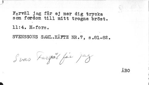 //// Farväl jag får ej mer dig trycka //// som fordom till mitt trogna bröst. //// 11:4. H-fors. //// * //// ----- j //// SVENSSONS SAML.HÄFTE NR.7, s.81-82. //// i //// ÅBO //// E //// H ////