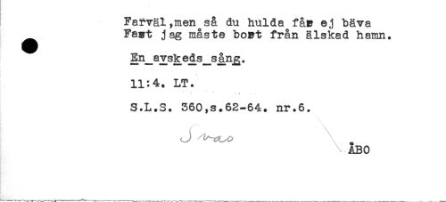 //// Farväl,men så du hulda få* ej bäva //// ^ Fasr6 jag måste boat från älskad hamn. //// En_a vsk ed s_s ån^. //// 11:4. LT. //// - * //// S.L.S. 360,s.63-64. nr.6. //// (J ^ //// ^ ÅBO ////