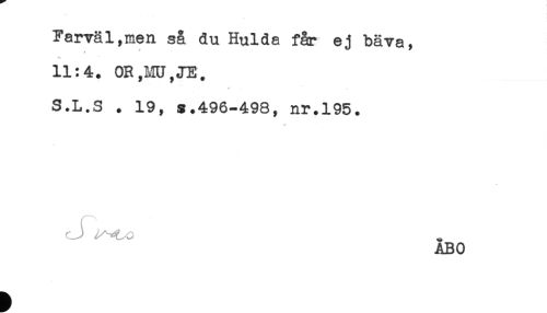 //// Farväl,men så du Hulda får ej bäva, //// 11:4. OR,MU,JE. //// ? //// S.L.S . 19, s.496-498, nr.195. //// ABO ////