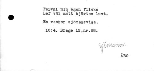 //// Farväl min egen flicka //// ^ Lef väl miått hjärtas lust. //// En vacker sjömansvisa. //// 10:4. Brage 12,nr.88. //// ÅBO //// / \ ____ ////