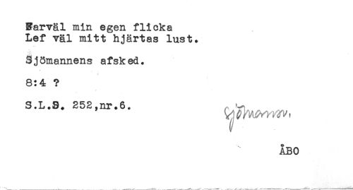//// Sarväl min egen flicka //// Lef väl mitt hjärtas lust. //// Sjömannens afsk ed. //// 8:4 ? //// S.L.S. 252,nr.6. ^ //// ÅBO ////
